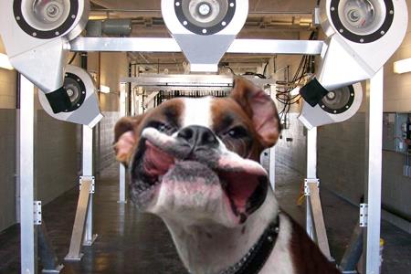 I literally envisioned, various pet owners standing at the window watching as their dogs of all breeds, sizes and colors, were being pulled along the track going through the various stations of the pet wash.
