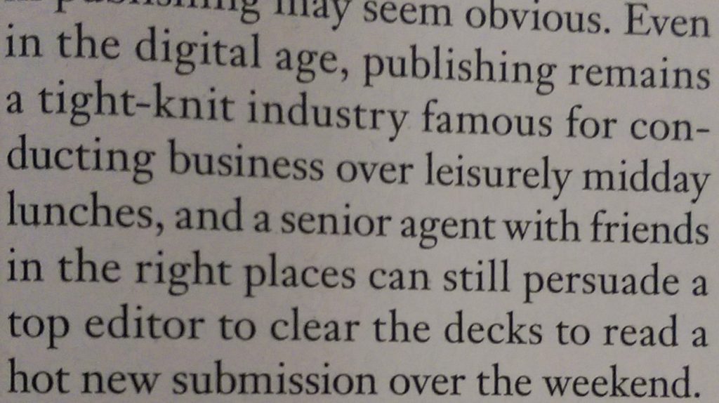 “Even in the digital age, publishing remains a tight-knit industry famous for conducting business over leisurely midday lunches and a senior agent with friends in the right places can still persuade the top editor to clear the decks to read a hot new submission over the weekend.”